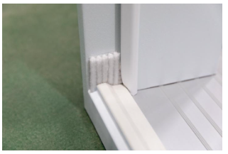 Woven pile corner pads on a polypropylene fin with a pressure-sensitive adhesive backing provide a better seal for the door corners against dirt and dust (compared to the foam pads).